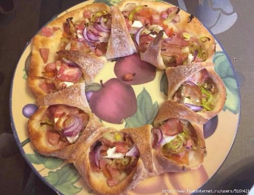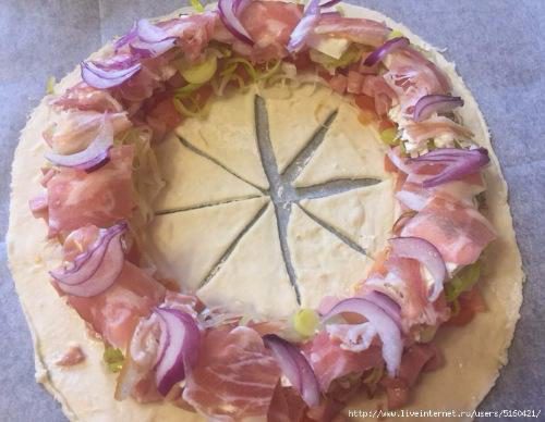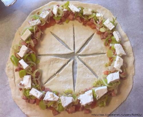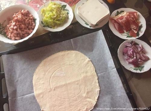 Тесто разморозилось, подошло, я раскатала его, вырезала большой круг, приготовила начинку. На какую фантазии хватило. Была свежая любительская колбаса, лук порей, брынза, сырокопченый бекон, сладкий ялтинский лук. Еще порезанный свежий помидор. Он в кадр не вошел почему-то...