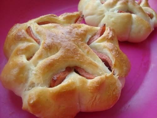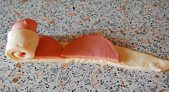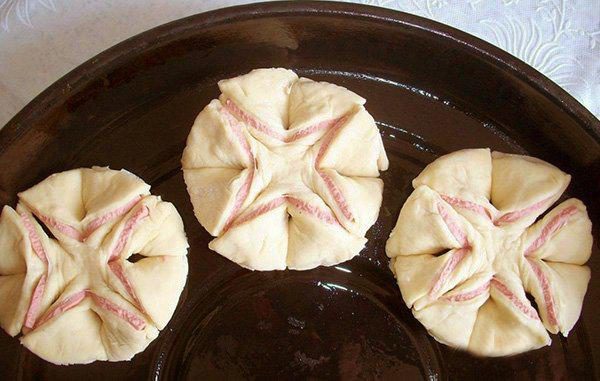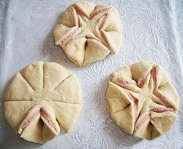 Свертываем полоски с колбасой в рулетики, слегка смачиваем водой место шва и тщательно закрепляем конец тестяной полоски, чтобы не разворачивался при выпечке.