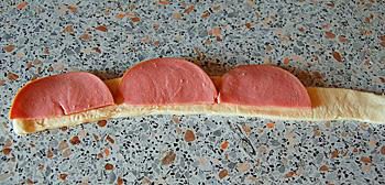 Полукружки колбасы выкладываем на полоску теста, оставляя свободным один конец тестяной полоски.