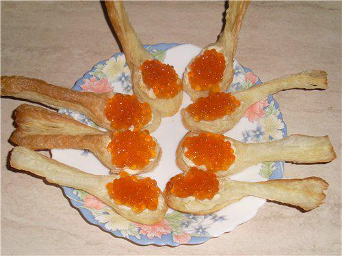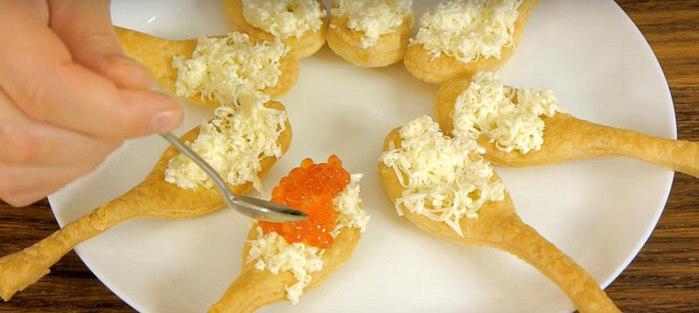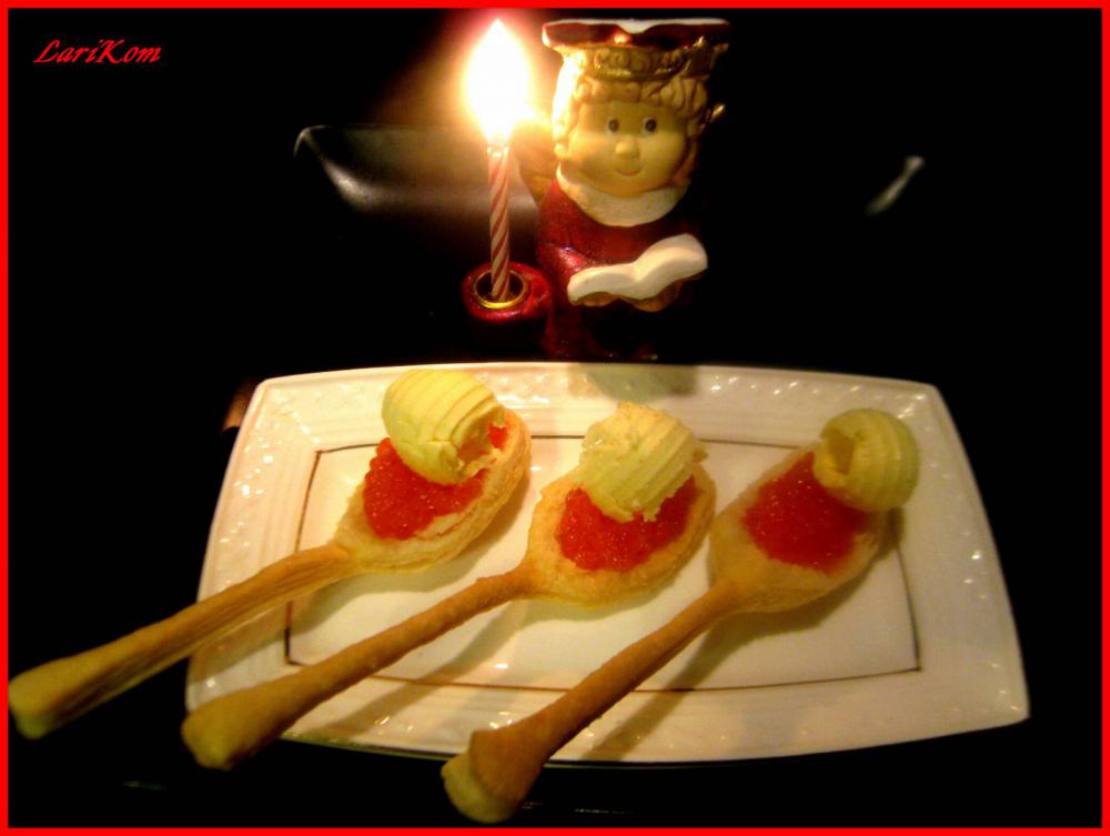 Можно натереть на терке замороженное масло, выложить его на ложки, а сверху положить икру!