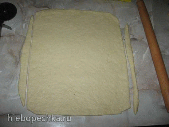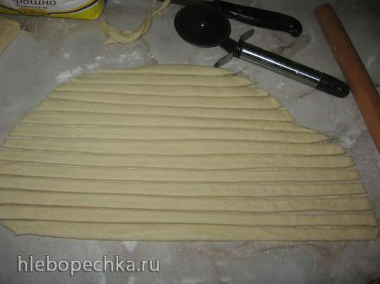 Готовое тесто раскатать в пласт (использовать одну часть теста) и разрезать его на длинные жгуты.