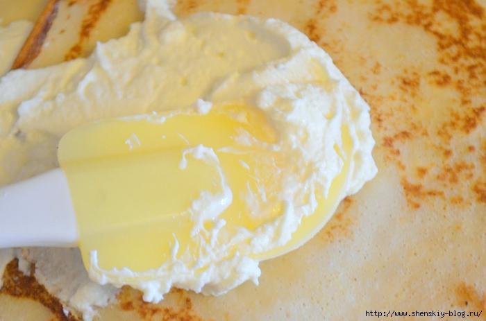 5. Для начинки: смешать творог, сметану и сгущенку. Намазать блин. Можно сложить 2 или 3 блина рядом как бы внахлест — получится полотно из блинов