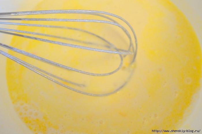 3. Добавить яйца и растопленное сливочное масло. Все взбить венчиком.