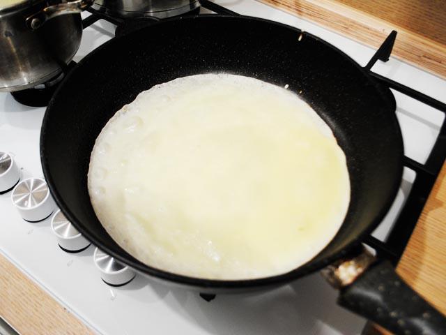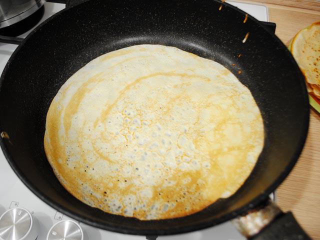 9. Налить половину половника теста и вращая сковородку, дать возможность тесту растечься очень тоненьким слоем. Выпекать 20 — 30 секунд, затем изделие перевернуть на другую сторону.