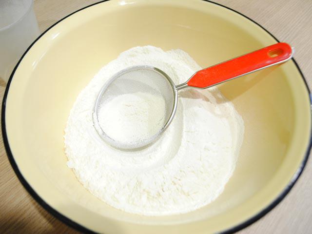 1. Просеять муку в миску. Делать это нужно обязательно, чтобы изделия получились более нежными и дырчатыми. Добавить в муку соль и сахар. Перемешать смесь.
