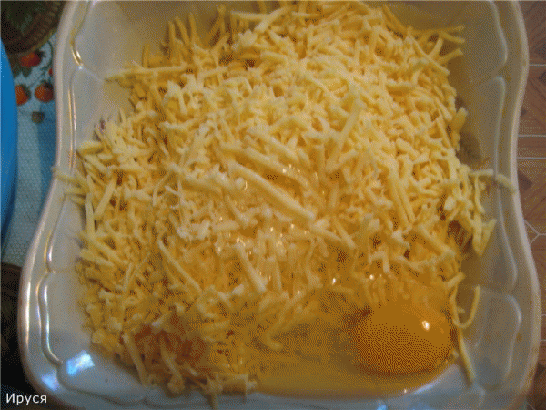 4.Сыр натираем на крупной терке, добавляем одно яйцо и перемешиваем. Начинка готова.