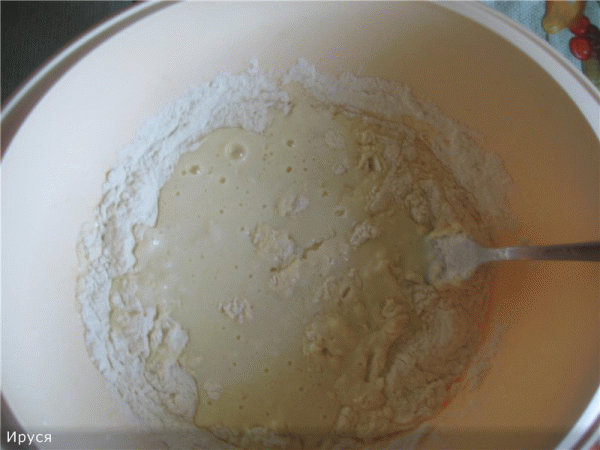 1.В кефир добавляем одно яйцо, сахар, соль и растительное масло, хорошенько перемешиваем