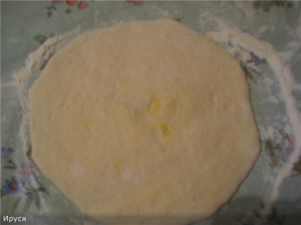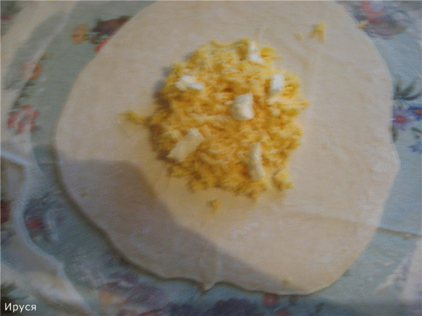 6. Из каждой части теста формируем лепешку, 7.В центр выкладываем сырную начинку и добавляем несколько кусочков сливочного масла, лучше если оно не будет замерзшим, так как может прорваться тесто.