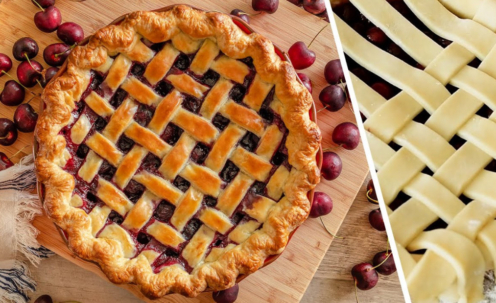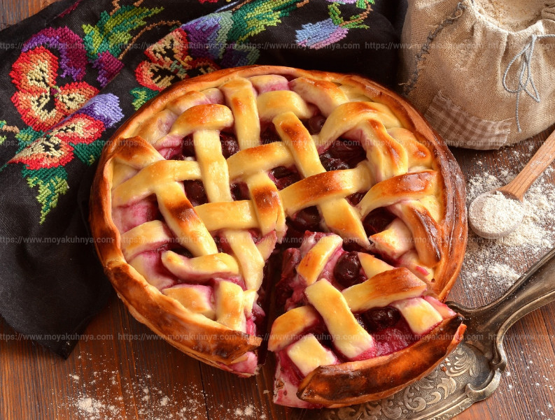 К оставшемуся тесту добавьте муки, замесите эластичное тесто. Сформируйте из него сеточку на поверхности пирога.