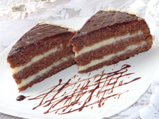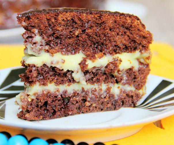 Приготовленный шоколадный бисквит разделить на 2 или 3 коржа, смазать их теплым кремом. Украсить вкусный сумасшедший пирог "Crazy Cake" по своему усмотрению.