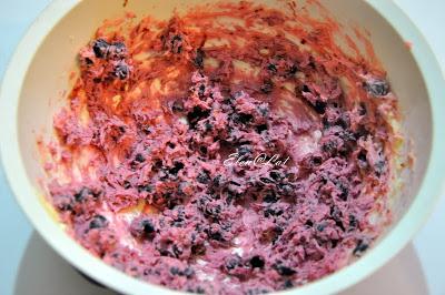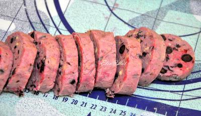К маслу и ягодам добавить муку, смешанную с крахмалом и орехами и быстро замесить тесто. Сформировать «колбаску» толщиной 3-4 см. Завернуть в фольгу и убрать в морозилку на 1 час.