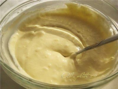 Майонез, сметану и яйца взбить, добавить муку и перемешать. Тесто получается жидковатым…
