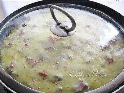 Тесто вылить на сухую сковороду и уже сверху положить начинку
