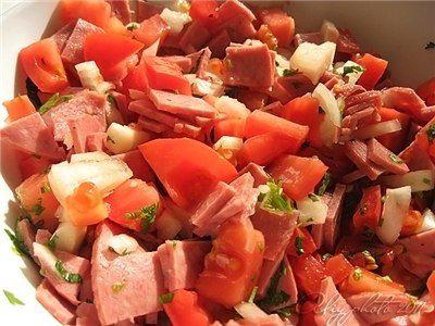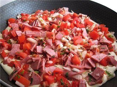 Или по своему вкусу (грибы, оливки…). У меня нашлось только колбаса, помидоры, лук и зелень…