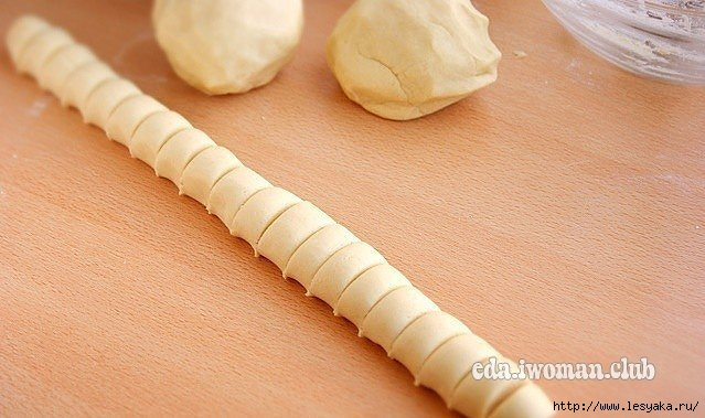 Из каждого куска теста скатайте «колбаску», а затем каждую «колбаску» нарежьте на кусочки размером с крупный грецкий орех.