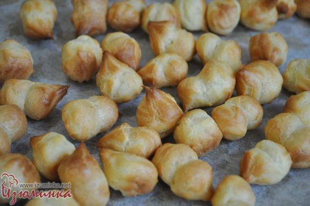 Готовое тесто перекладываем в кондитерский мешок и отсаживаем на лист пекарской бумаги, стараясь ограничиваться минимальным размером.