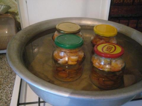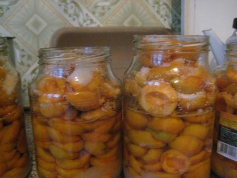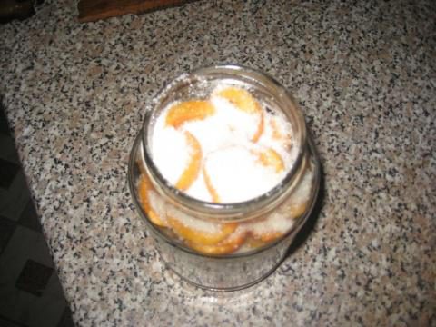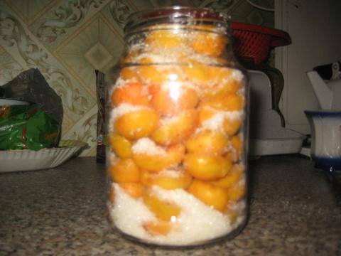Итак, вначале я их помыла и вытащила косточки. Потом простерилизовала банки и крышки. В банки насыпала тонким слоем сахар, сверху половинки абрикос, опять сахар и опять абрикосы и так доверху, но не утрамбовывать.