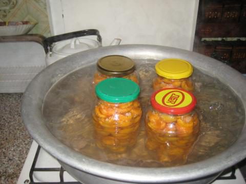 В любую подходящую емкость наливаем воды, на дно надо положить какую нибудь тряпочку, и ставим баночки, прикрытые крышками, но не закрученные. Включаем газ, и после закипания стерилизуем минут 15-20, потом закручиваем крышку, переворачиваем банку и все, пусть остывает.