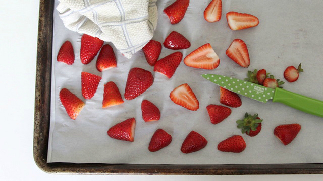 5) Положите фрукты на поднос, накрытый пергаментной бумагой. Затем накройте фрукты полиэтиленовой пленкой. Поставьте поднос в морозильник на ночь. Если места в морозильной камере не много, можно воспользоваться обычной тарелкой.