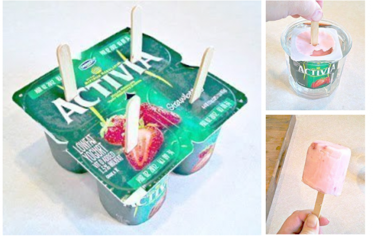 Возьмите любой йогурт в стаканчиках и, не открывая, вставь деревянные палочки.