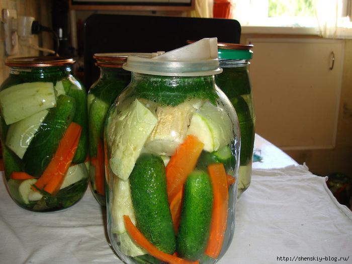 2. Укладываем в банку листья вишни и смородины, чеснок и перец. Затем, плотно друг к другу, укладываем рядками огурцы, на этот раз мне подкинули молоденькие кабачки, ну и морковь положила. Она, кстати, тоже очень вкусная получается, сверху лист хрена, чтобы кипяток напрямую не попадал на овощи.