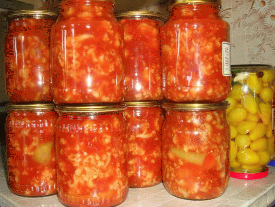 - Горячую овощную смесь разложите по стерилизованным стеклянным банкам и закатайте крышками.