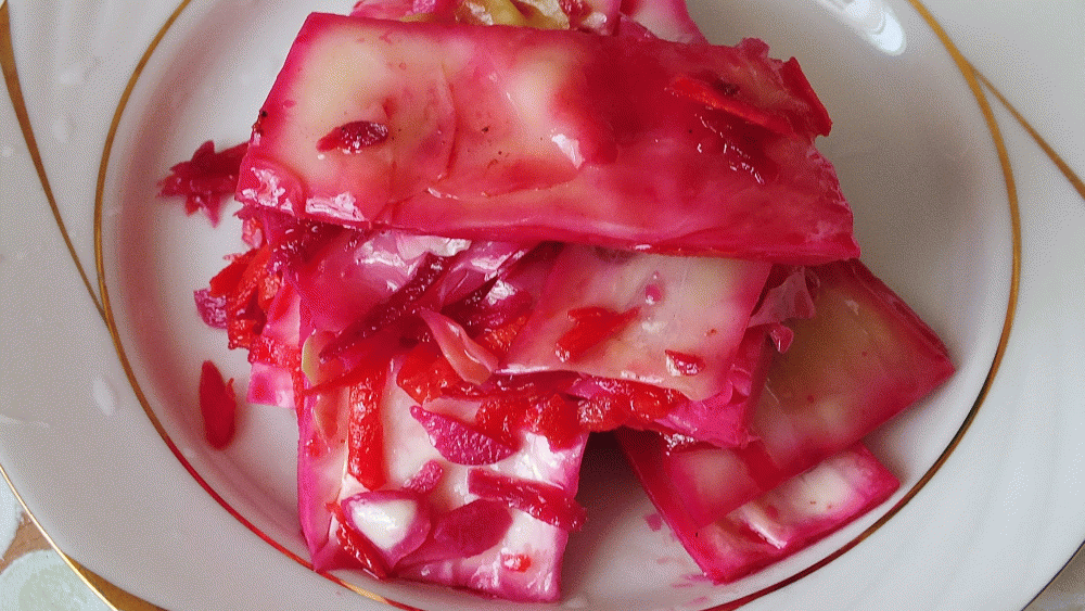 Выкладываем капусту, нарезанную кубиками среднего размера, можно порезать ломтиками. Добавляем несколько маленьких кусочков ярко-красной свёклы. Вообще то, количество свеклы добавляется - в зависимости от того, какой вы желаете иметь цвет заливки - яркий бордовый или розовый.