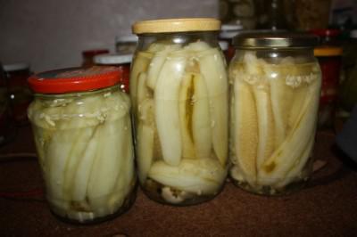 Этот салат готовится из старых, переросших огурцов. Многие хозяйки не знают, что делать с такими огурцами, ведь обычным способом их не законсервируешь, да и в летнем салате они не очень вкусны. Однако не торопитесь расстраиваться, для зимнего салата вы всегда можете использовать даже такие огурцы-"башмаки", которым никак не можете найти достойного применения. Как говорила ваша бабушка, у хорошей хозяйки ничего не пропадёт.