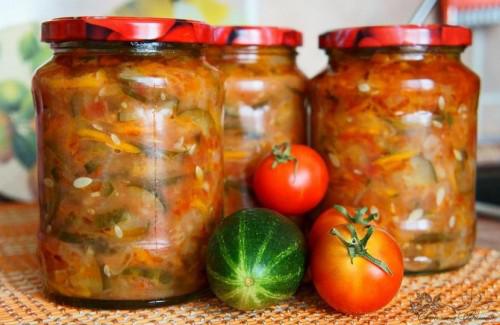 Затем салат выложить в стерилизованые банки, утрамбовывая – должен выйти лишний воздух, закатать крышками.