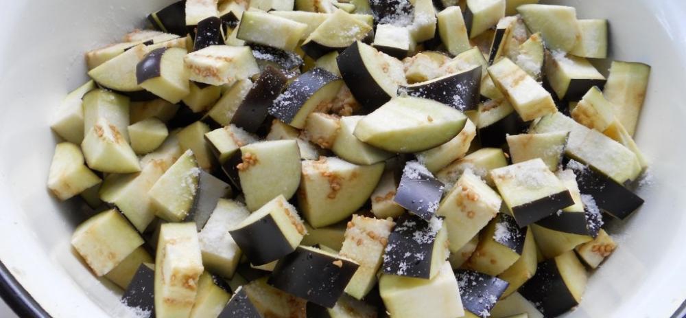 Баклажаны помыть, удалить хвостики и нарезать средними кубиками. Хорошо посолить и оставить на 2 часа.