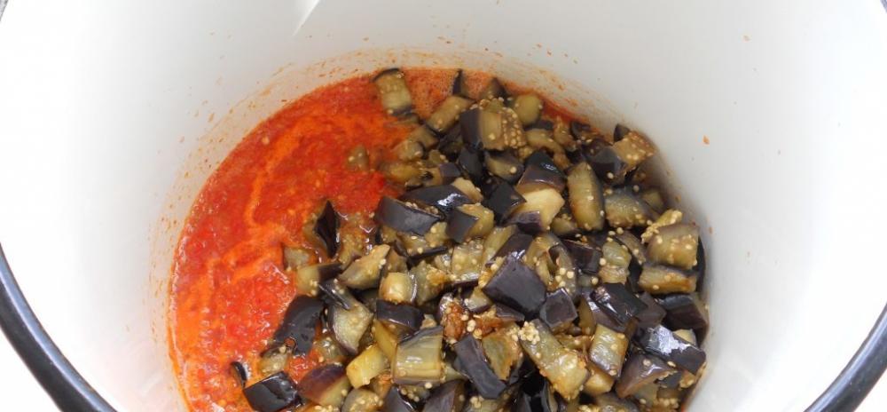 Баклажаны отжать и обжарить на растительном масле в течение 15-20 минут до слегка румяной корочки. Смесь из перца и чеснока вылить в глубокую кастрюлю, довести до кипения, прокипятить 5 минут. Добавить обжаренные баклажаны.