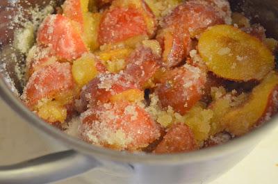 1. Сливы моем, режем на половинки и укладываем в кастрюлю. Засыпаем 250 гр сахара и убираем на ночь в холодильник.