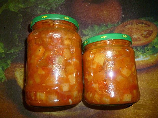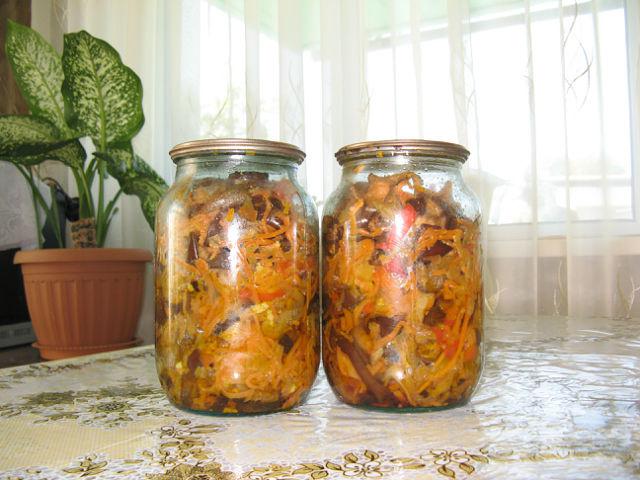 Затем перемешать баклажаны с остальными овощами и разложить по банкам. Стерилизовать 0,5л банки по 20 минут, 0,7л - по 30. Затем закатать.