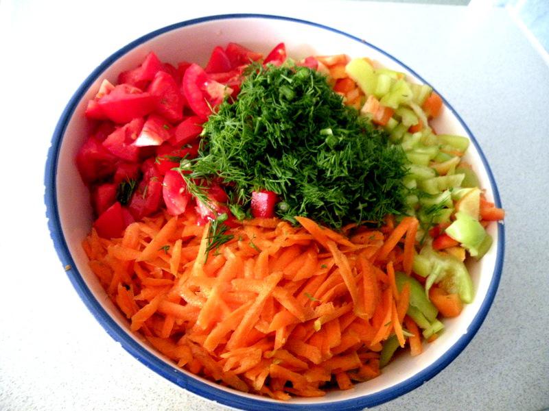 Морковь пропускаю через комбайн, на средней тёрке (почти как на корейской получается, но можно тереть как хотите), перец режу соломкой.
