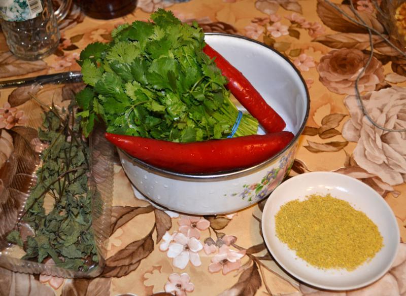 Пока слива «дает сок», почистим чеснок, острый перец освободим от жгучих семян, а кинзу – вымоем и обрежем корешки – нам нужна зелень.