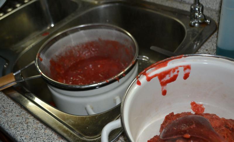 После закипания варим минут 5-10, снимаем с огня и начинаем протирать массу сквозь сито – нужно получить сливовое пюре, очищенное от шкурок. Кстати, это не так сложно. Шкурки потом можно использовать для начинки в сливовый пирог. Они сухие и не так текут при выпечке. Конечно, в начинку для пирога потребуется добавить сахар, корицу, можно и пектин (для пирога!).