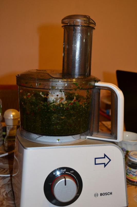 Пока кто-нибудь мешает пюре, оставшиеся ингредиенты – кинзу, мяту, чеснок и перец нужно перемолоть. Можно сделать это в комбайне. Получившуюся нарубленную массу и хмели-сунели, а также соль кладем в уваривающуюся массу и варим 10 минут.