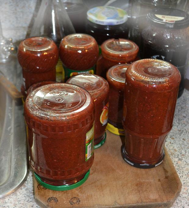 Вкуснейший ткемали готов! Разливаем по стерилизованным банкам, закрываем их и переворачиваем для стерилизации крышек.