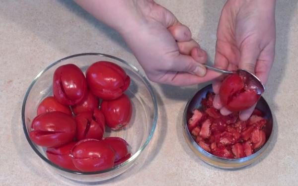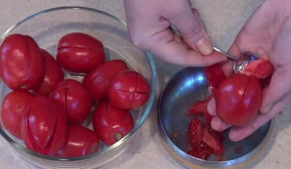 Вначале каждый помидор надрезаем крест-накрест, но не до конца, затем чайной ложкой вынимаем внутренности каждого помидора.
