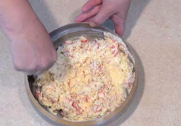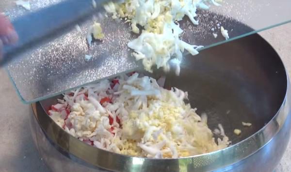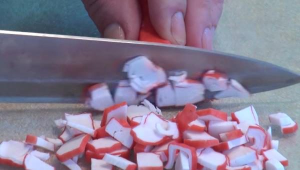 Теперь берем отдельную чашу и ссыпаем туда нарезанные кубиками крабовые палочки.