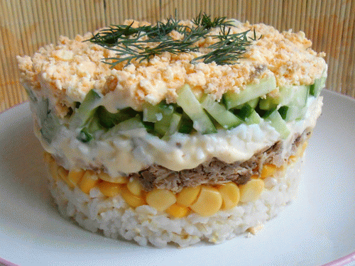 Убрать салат на пару часов в холод, чтоб все слои могли хорошо пропитаться.