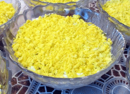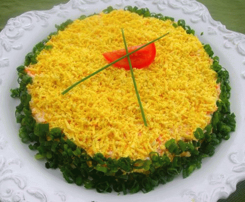 В завершении салат покрывается желтками и украшается порубленной зеленью.