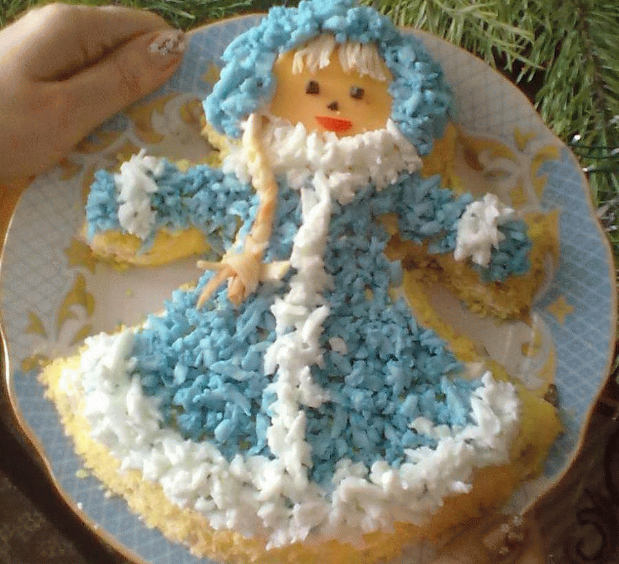 Салат слоеный, поэтому выкладываем на плоское блюдо слои по очереди в виде фигурки Снегурочки: