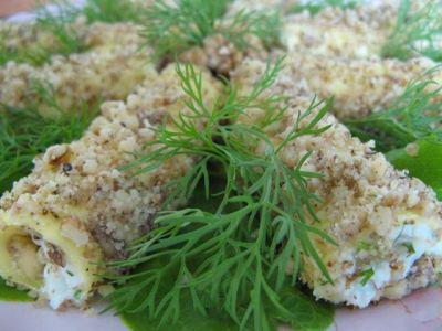 На пластик сыра выкладываем 1 ч.л. начинки. Скатываем в трубочку. Обмазываем кисточкой нашу трубочку тонким слоем майонеза и «панируем» в мелко потолченном орехе. Выкладываем на листья салата или просто на блюдо и украшаем веточками укропа или петрушки.