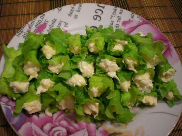 На каждый листочек положить чайную ложку сырной массы и завернуть в трубочку.