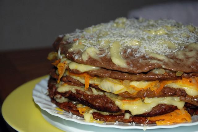 Накроем следующим блинчиком и повторим процедуры смазывания и выкладывания.