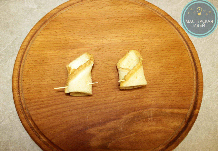 У каждого хлебного треугольника сворачиваю сперва один угол, сверху накрываю вторым и скрепляю зубочисткой. Получаются вот такие "конвертики".