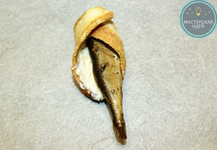 Вынимаю из хлебных конвертиков зубочистки и смазываю их внутри сыром с майонезом, далее выкладываю шпроты.