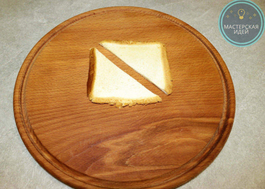 Начинаю с приготовления хлебной основы для закуски. Я использую хлеб для тостов, так как он хорошо принимает нужную форму. Итак, раскатываю скалкой ломтики тостового хлеба и каждый ломтик разрезаю по диагонали и получаю два треугольника.