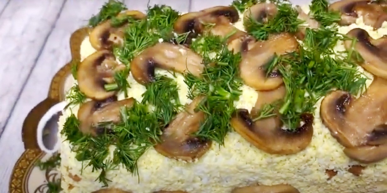 Закусочный торт-салат для гурманов, настоящих ценителей вкусных и нестандартных блюд. Здесь удачно сочетаются шампиньоны и копченое куриное мясо. Салат получается красивым и аппетитным на вид, сытным и очень вкусным! А приготовить такое чудо совсем не трудно - смотрите три видео-рецепта приготовления.